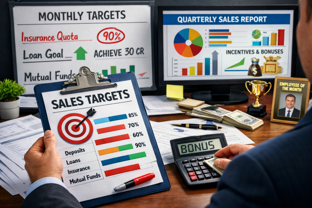 He has targets. Deposits, Loans, Third party products, Insurance, Mutual funds, Cross sell ratios, Quarterly numbers, Year end pressure.