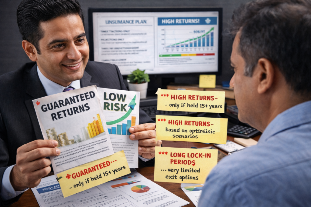 Six months later, he realizes he cannot exit without heavy charges. The “guaranteed” returns were not really guaranteed. And the product was never aligned with his actual goals.